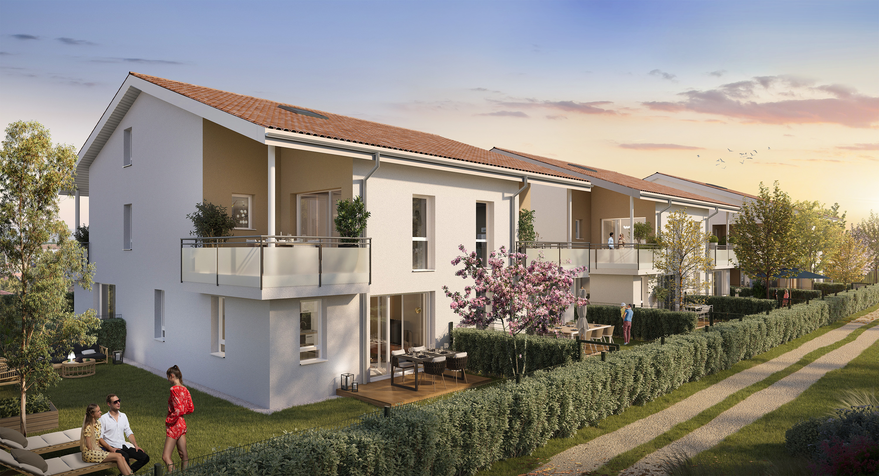 Les 3 petits bâtiments du « Montgomery » donnent l’effet de maisons de ville accolées, dans un écrin de nature. La résidence est entourée de beaux jardins, où les arbres conservés créent une barrière naturelle avec les alentours. Avec seulement 16 logements répartis dans les 3 bâtiments, la résidence offre ainsi un cadre préservé et intimiste à tous les résidents. Ces faibles hauteurs, conjuguées aux toitures en tuile rouge, permettent à la résidence de s’intégrer parfaitement au tissu environnant. Les façades proposent une alternance de tons, entre les enduits blanc cassé ou sable/beige, donnant du rythme au projet.