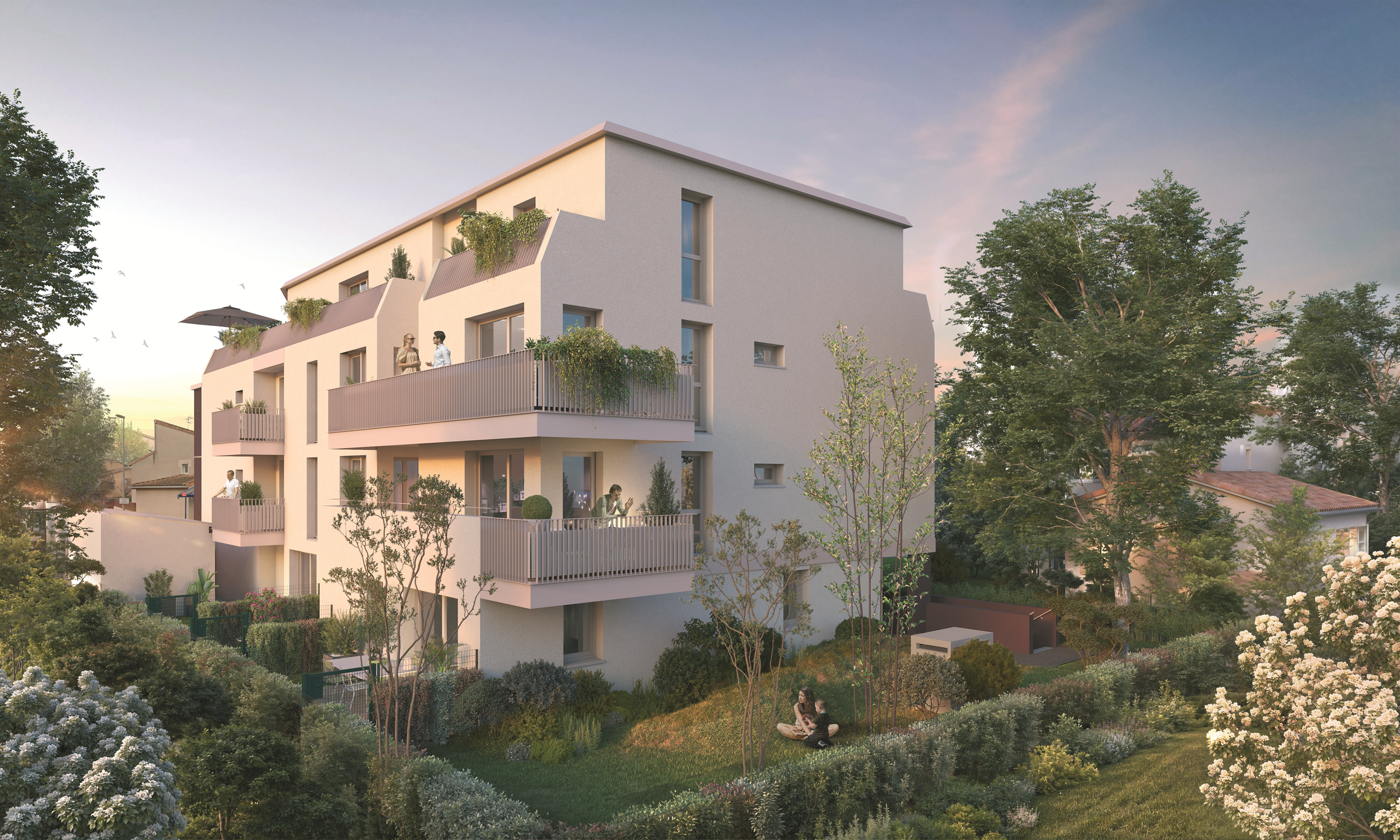 Véritables pièces supplémentaires prolongeant les appartements, les jardins, balcons et terrasses proposent une vue directe sur les espaces verts de la résidence.