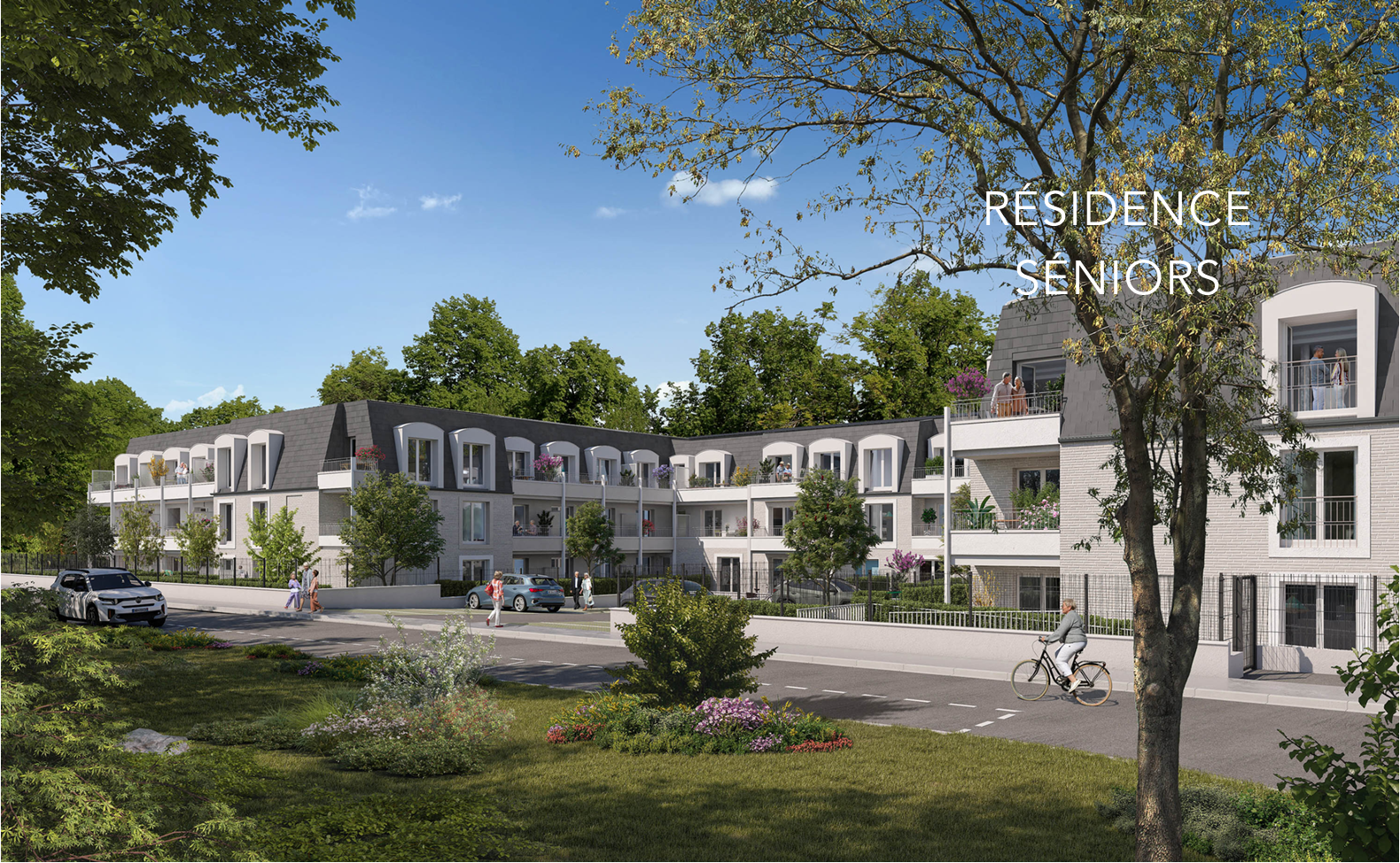 Cette résidence de taille moyenne favorise la convivialité tout en préservant l’intimité de chaque occupant. Son architecture se caractérise par une esthétique sobre, inspirée par l’élégance des immeubles bourgeois parisiens. Les bâtiments associent des toitures mansardées couleur ardoise et des façades en parement beige clair, rythmées par d’élégantes lucarnes et de larges balcons filants qui offrent un style intemporel.