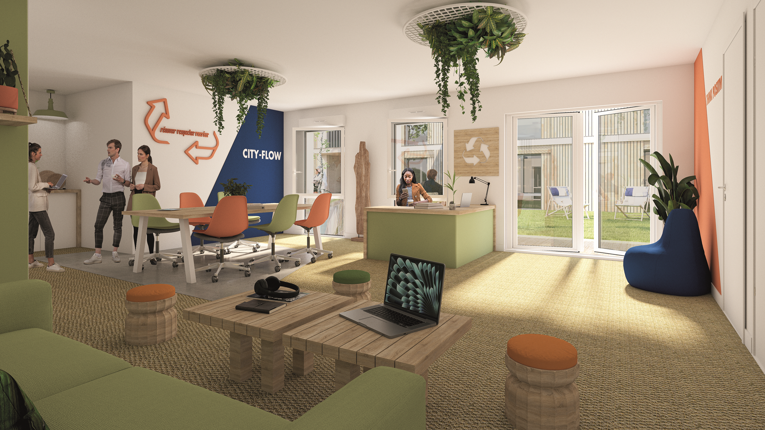 Dans une ambiance « slow design », le mobilier contemporain upcyclé conçu sur mesure et les aménagements modulaires permettent aux résidents de partager des temps de convivialité. Une zone de travail : Un espace de coworking confortable indépendant de la pièce de vie.
