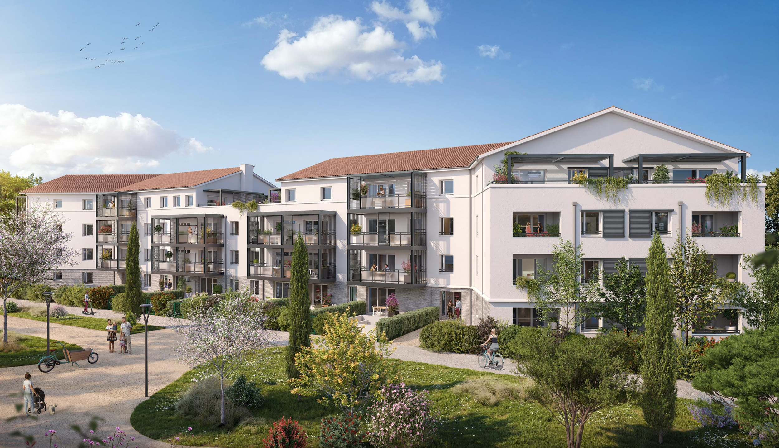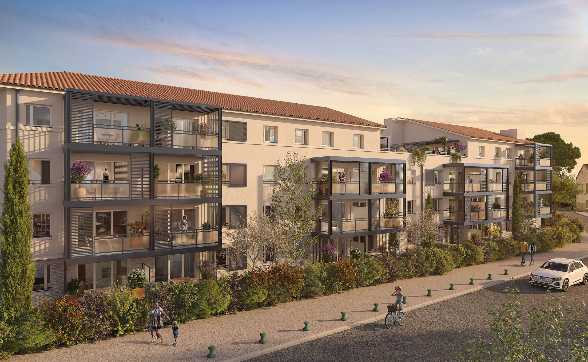La résidence « Ondea » se compose d’un bâtiment de 3 étages, implanté en retrait pour créer une percée visuelle et valoriser les cheminements piétons dans un cadre paysager soigné. Son architecture mêle inspiration toulousaine (tuiles canal, briquette) et écriture contemporaine (menuiseries et balcons gris), offrant un ensemble harmonieux et lumineux, parfaitement intégré à son environnement. Les logements proposent de beaux volumes et des prestations de qualité, pensés pour le confort au quotidien.